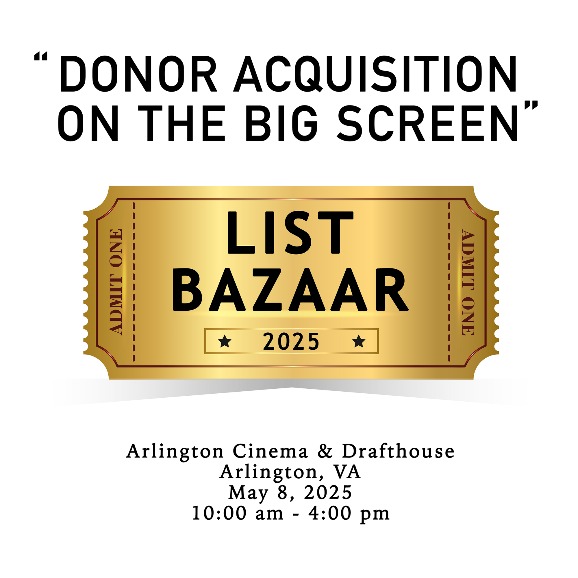 You won’t want to miss the summer’s blockbuster donor acquisition event when List Bazaar 2025 takes its place ON THE BIG SCREEN May 8 at Arlington Cinema and Drafthouse in Arlington, VA (minutes from Reagan National Airport).